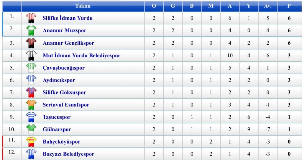 Mersin Süper Amatör Küme’ye çıkmak için iddialı bir kadro kuran Silifke İdmanyurduspor, Silifke Belediyesi Ünal Ünüvar Tesislerinde Sertavul Esnafsporu 3-0 yenerek 6 puanla liderliğe yükseldi. Silifke Göksuspor, Silifke Şehir Stadında karşılaştığı Bozyazı Belediyespor’u 1-0 yendi. Silifke Gülnarspor ise Mut deplasmanında Mut İdman Yurdu’na 8-1 mağluğ oldu. Taşucuspor ise Taşucu Stadında karşılaştığı Çavuşbucağıspor’a 5-1 yıkıldı. Silifke Bahçeköyspor ise Silifke Şehir Stadında karşılaştığı Anamur Gençlikspor’a 1-0 yenildi. Gruptaki diğer maçta ise Anamur Muzspor Aydıncıkspor’u 1-0 yendi.