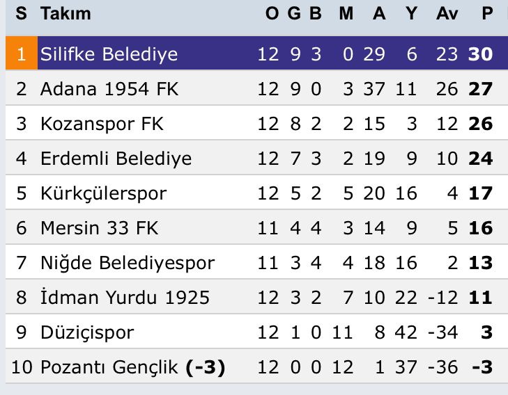Spor Toto Bölgesel Amatör Lig 4. Bölge 1. Grupta ilk devreyi namağlup lider bitiren Silifke Belediyespor, Düziçi deplasmanında Düziçispor’u 4-0 yenerek 30 puanla namağlup liderliğini sürdürdü. Grupta Silifke Belediyespor 30 puanla namağlup liderliğini sürdürürken, Adana FK 27 puanla 2. ve Kozanspor 26 puanla 3.sırada bulunuyor.